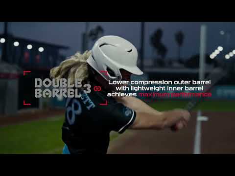 Close-up of a black softball bat with white text that reads Double Barrel 3. Red accents and a stadium background with a glowing red hue are visible, giving a dynamic and sporty feel to the image.