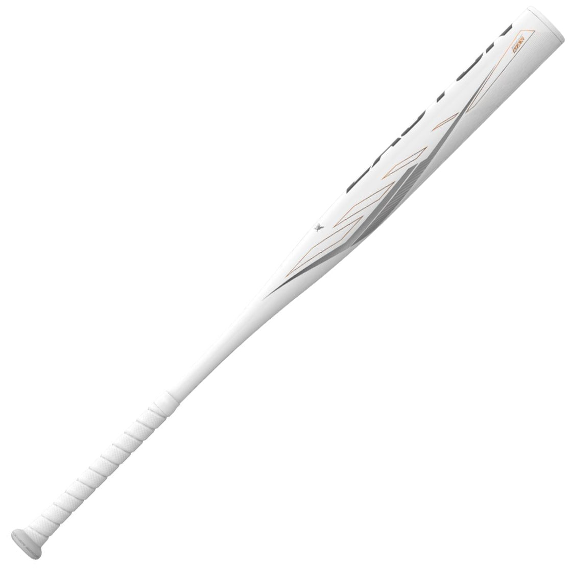 Close-up of a sleek white baseball bat labeled DOUBLE BARREL EXT in metallic letters, with an abstract, radial orange and white background design.